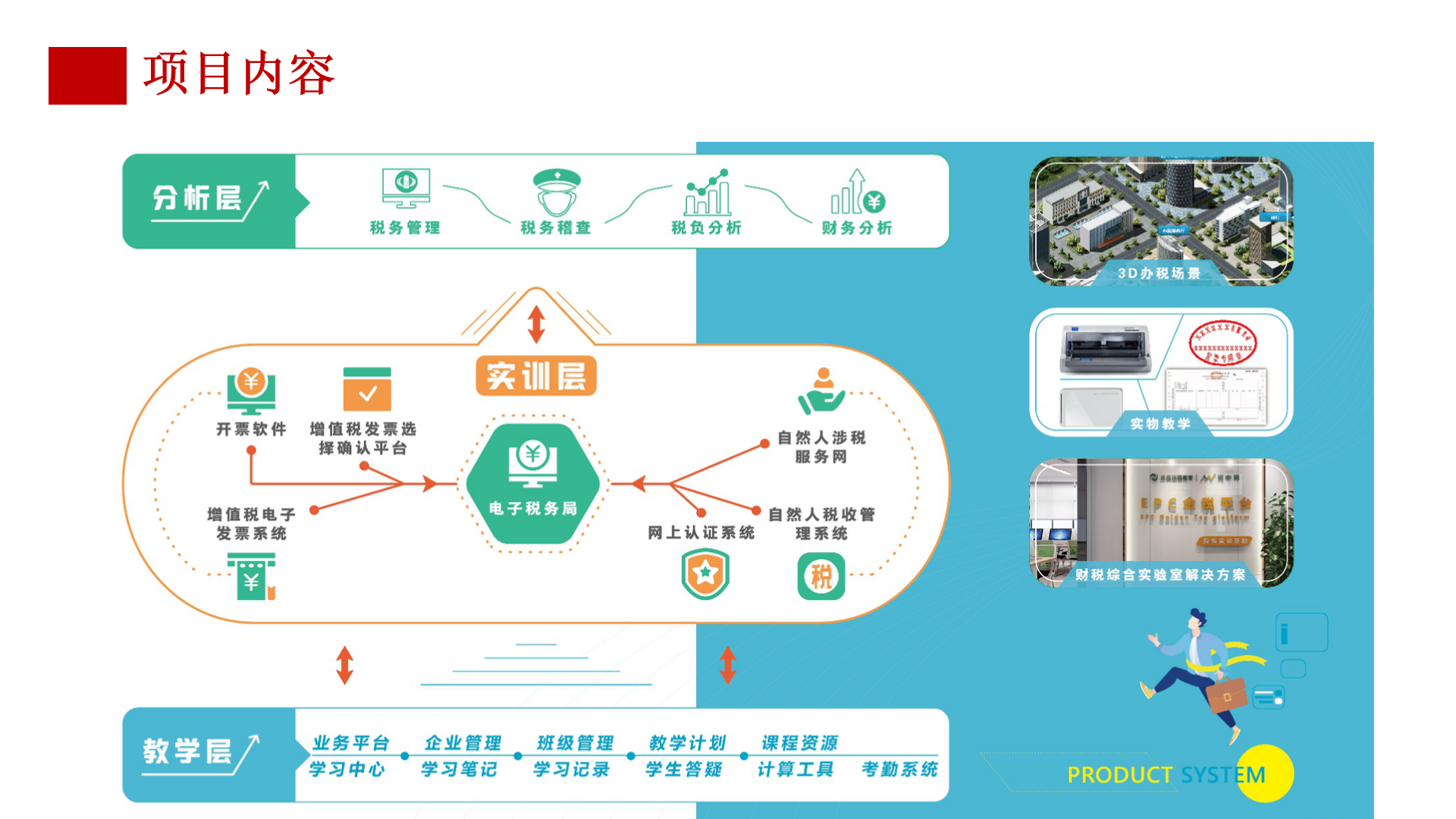 智能金税实训帮助我院适应金税三期新形势,与时俱进,加强财税实践教学,让学生适应企业税务帮助高校工作变化。模拟实训从制造、房地产、运输、服务等多种行业多家企业出发,覆盖增值税、企业所得税、消费税、印花税等国地税全税种,通过分税种知识平台、开票系统、认证系统、选择确认平台、个税扣缴系统、电子发票系统、报税系统、税务稽查、税负分析等业务,把企业报税案例和真实的报税系统融为一体,结合3D技术还原办税场景,增强学生的办税实践能力和综合能力。使学生掌握企业报税具体操作流程及经济业务的税收本质,实现学生和税务管理岗位的无缝对接。